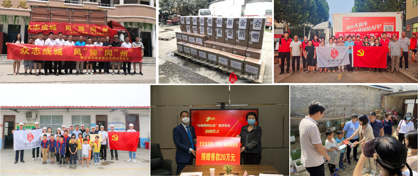 北京市京师(郑州)律师事务所不断寻找律所和慈善公益的契合点,探索建立可持续的慈善机制,履行律所社会责任。在与郑州慈善总会、河南省慈善总会的合作基础上,先后成立了“京师郑州公益”慈善基金与“紫荆基金”两大基金。
